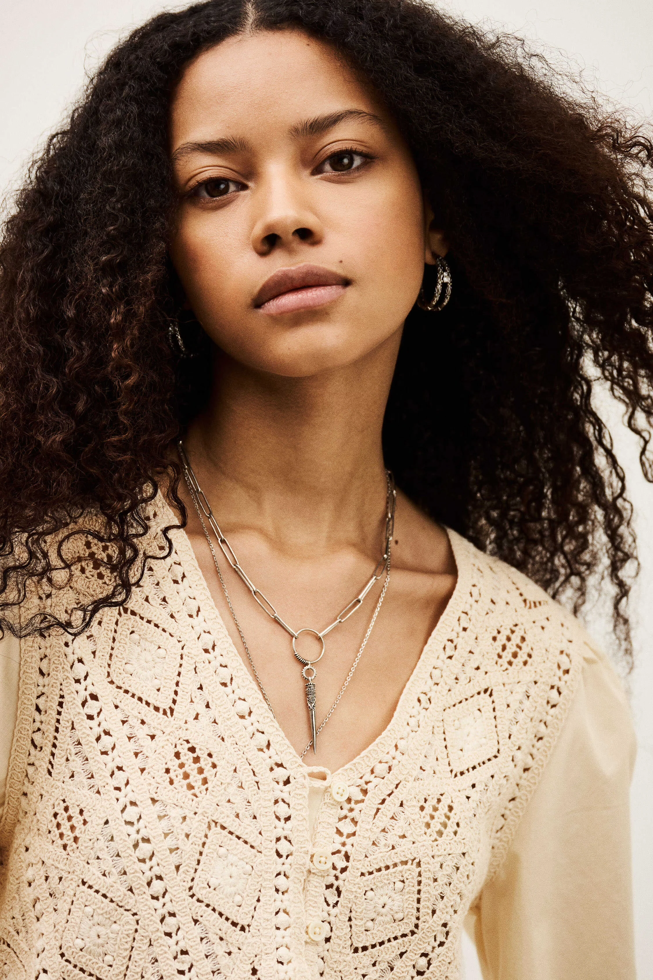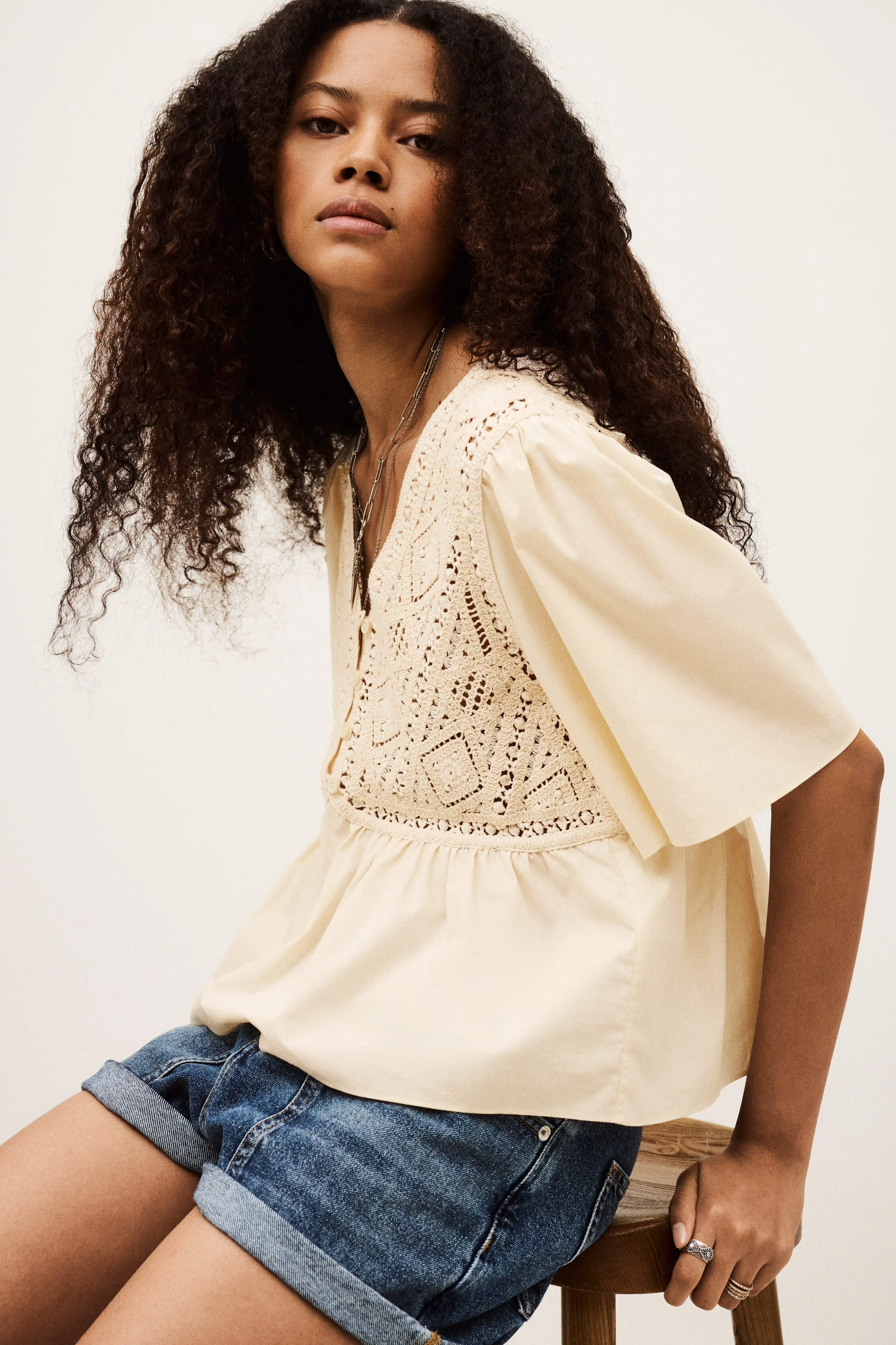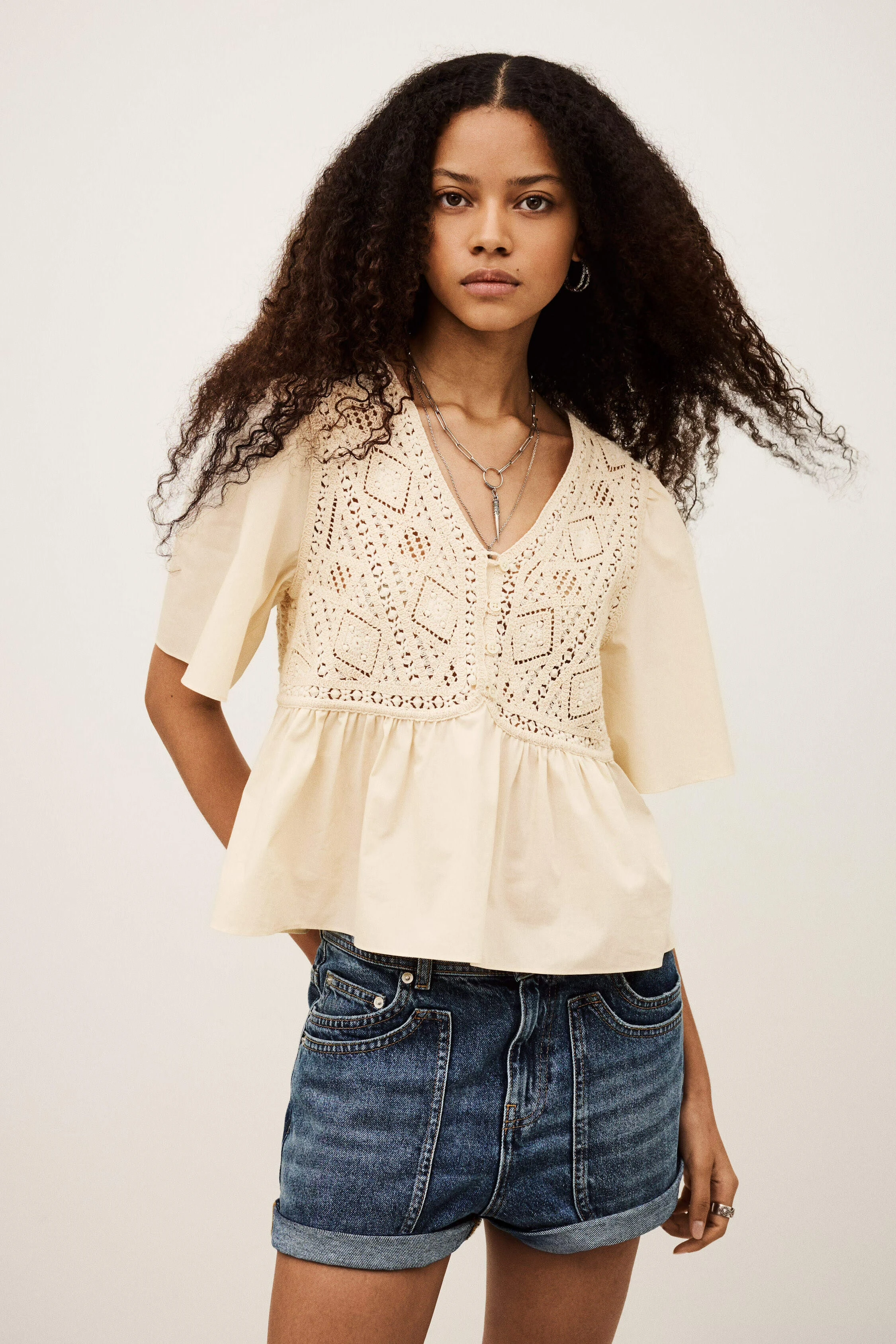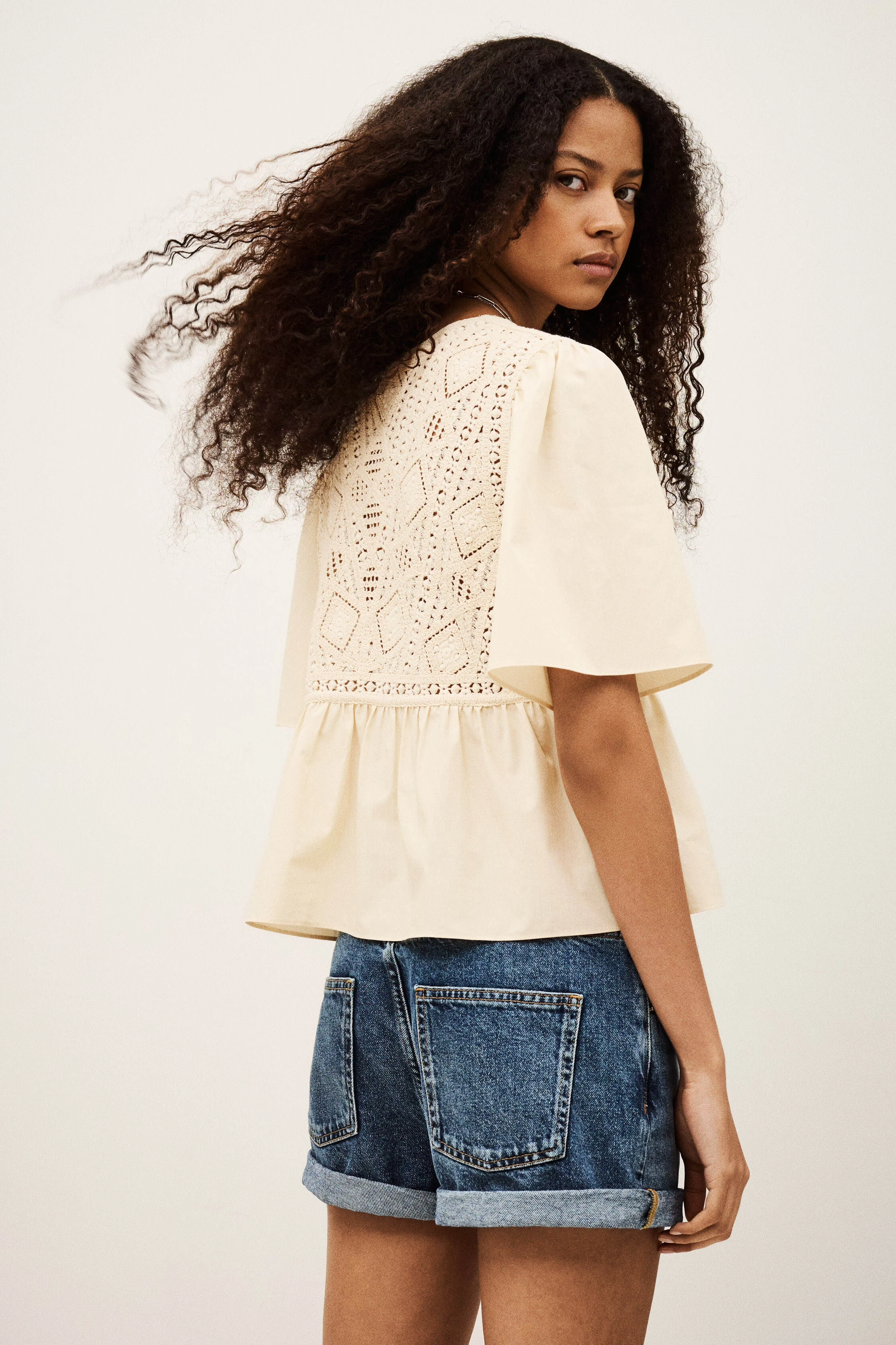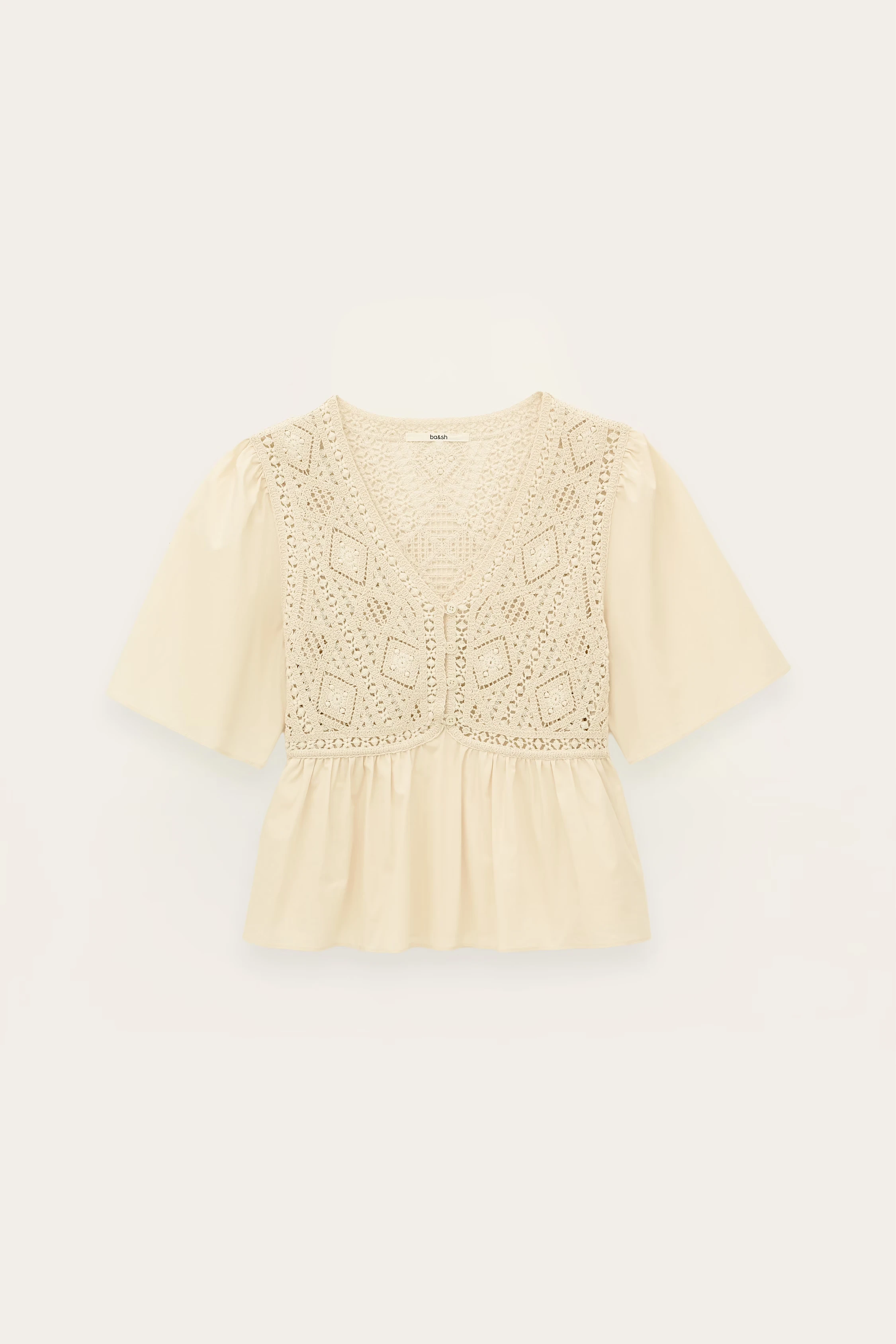 BA&SH SALVI - Beżowa koszulowa bluzka z szydełkowymi wstawkami