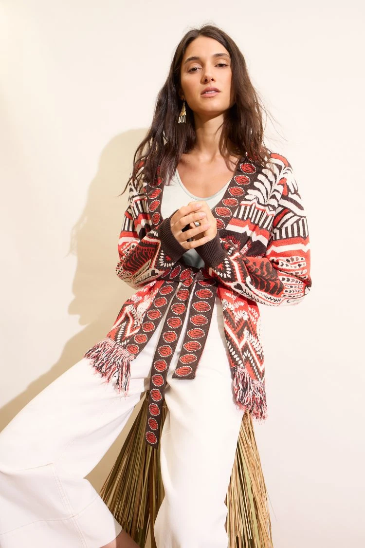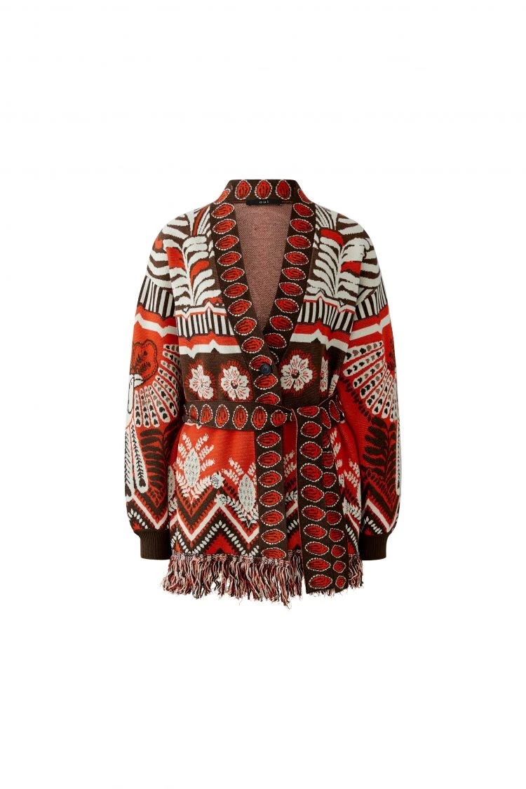 Kardigan z pięciu różnych włóczek z wszytym wzorem żakardowym w kwiaty i motywy etniczne