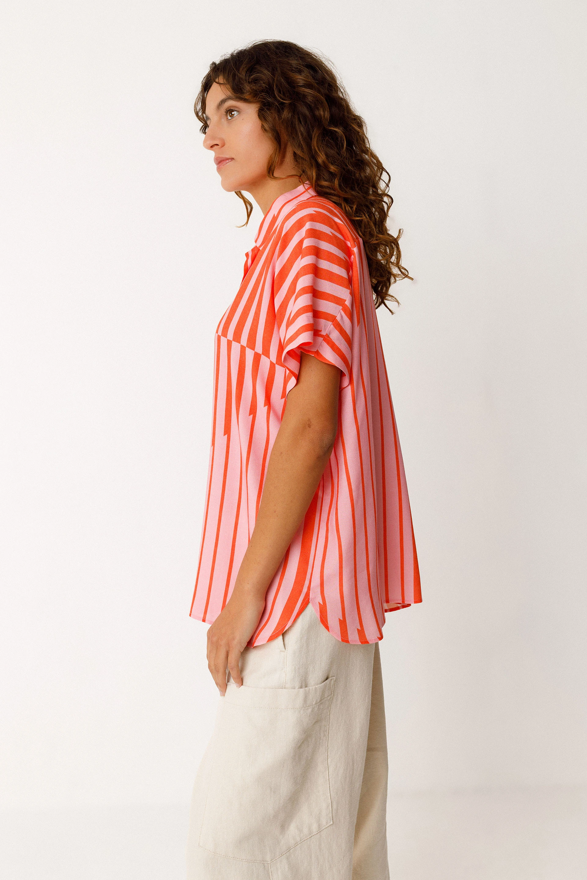 Koszula bez rękawów, z klasycznym kołnierzykiem i zapięciem na guziki z przodu.