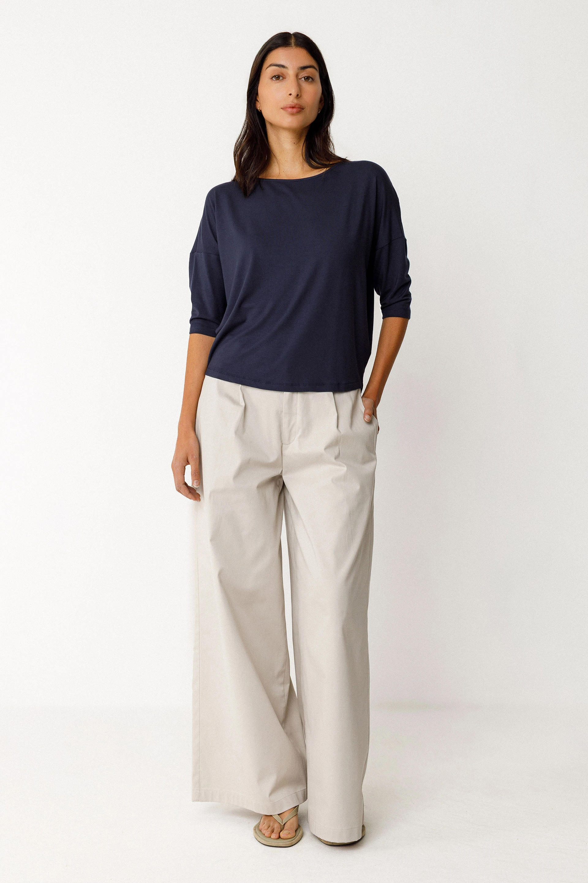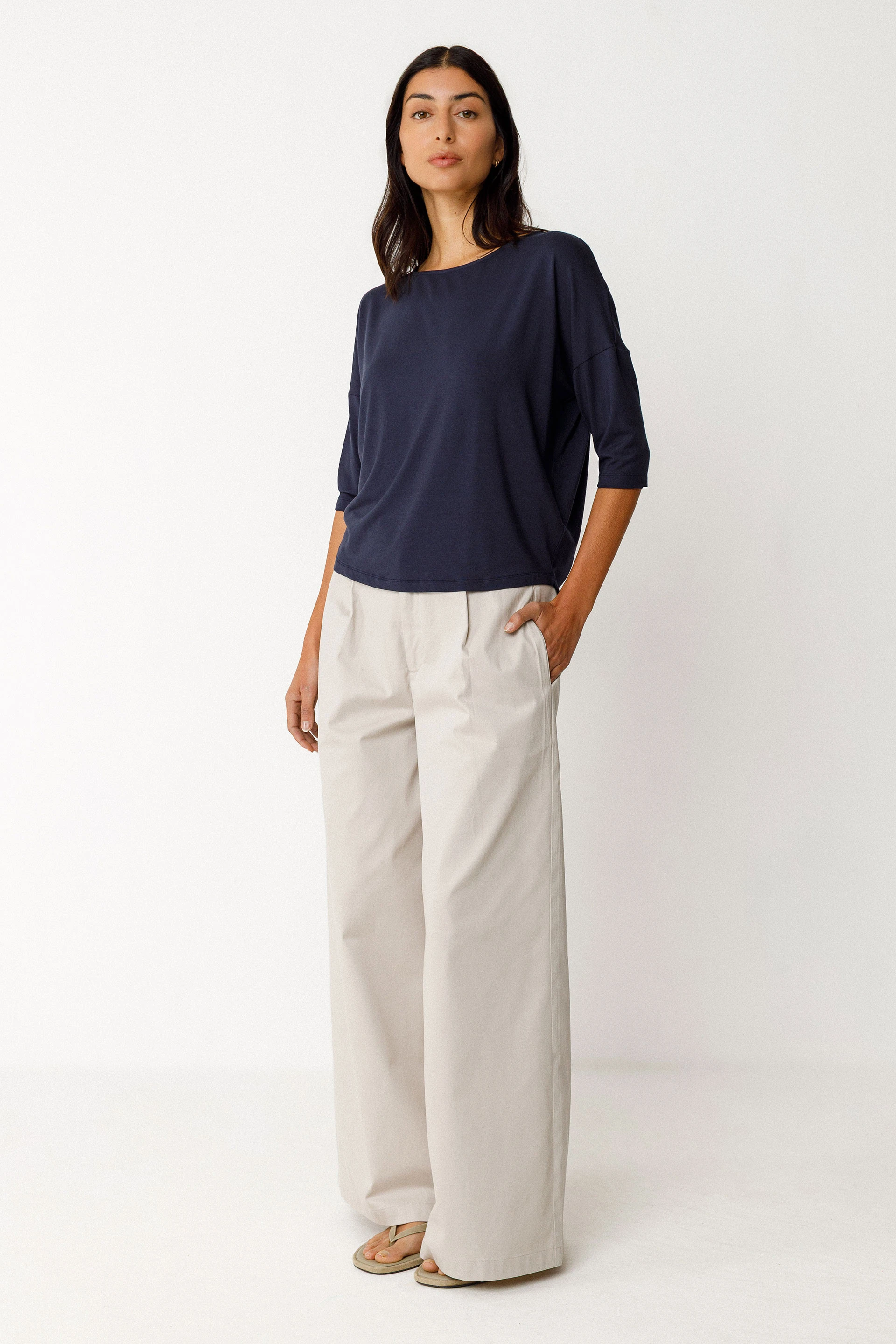 Luźna bluzka z dekoltem w łódkę i rękawami o długości 3/4. Granatowa.